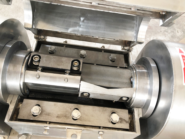 該機(jī)由機(jī)架、電機(jī)、進(jìn)料斗和粉碎機(jī)構(gòu)四個(gè)部件組成,物料經(jīng)進(jìn)料斗直接進(jìn)入粉碎室,經(jīng)中速旋轉(zhuǎn)的動(dòng)刀與定刀的強(qiáng)力剪切達(dá)到粉碎的目的 。通過(guò)調(diào)節(jié)動(dòng)刀與定刀的間隙,控制所得顆粒的大小。通過(guò)篩網(wǎng)的控制將達(dá)到要求的顆粒從出料口排出,而未達(dá)到要求的物料在粉碎室內(nèi)繼續(xù)剪切粉碎,直至達(dá)到要求。