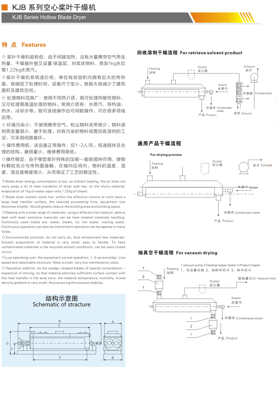 空心軸上密集排列著楔型中空槳葉,熱介質(zhì)經(jīng)空心軸流經(jīng)槳葉。單位有效容積內(nèi)傳熱面積很大,熱介質(zhì)溫度從-40℃到320℃,可以是水蒸汽,也可以是液體型:如熱水、導熱油等。間接傳導加熱,沒有攜帶空氣帶走熱量,熱量均用來加熱物料。熱量損失僅為通過器體保溫層向環(huán)境的散熱。楔型 槳葉傳熱面具有自清潔功能。物料顆粒與楔型面的相對運動產(chǎn)生洗刷作用,能夠洗刷掉楔型面上附著物料,使運轉(zhuǎn)中一直保持著清潔的傳熱面。槳葉干燥機的殼體為W型,殼體內(nèi)一般安排二到四根空心攪拌軸。殼體有密封端蓋與上蓋,防止物料粉塵外泄及收集物料溶劑蒸汽。出料口處設(shè)置一擋扳,保證料位高度,使傳熱面被物料覆蓋而充分發(fā)揮作用。熱介質(zhì)通過旋轉(zhuǎn)接頭,流經(jīng)殼體夾套及空心攪拌軸,空心攪拌軸依據(jù)熱介質(zhì)的類型而具有不同的內(nèi)部結(jié)構(gòu),以保證最佳的傳熱效果。