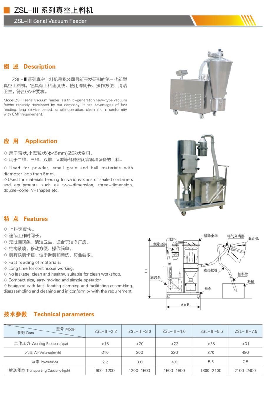 產(chǎn)品概述ZSL系列真空上料機是我公司最新開發(fā)研制的第三代新型真空上料機,它具有上料速度快、用周期長、操作方便、清潔衛(wèi)生,符合“GMP”要求。